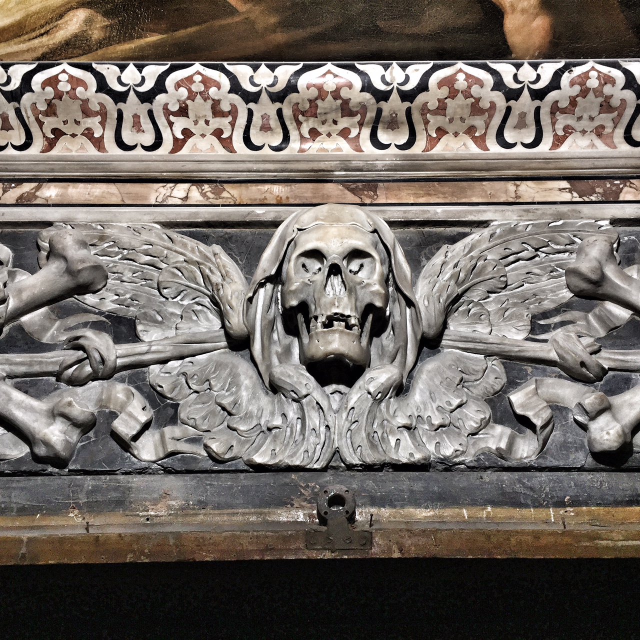 Chiesa di Santa Maria delle Anime del Purgatorio ad Arco. Dettaglio. Le 4 ossa ai lati del teschi rappresentano i 4 elementi, ovvero la fugacità della vita, i nodi sono le prove da superare, il cappuccio sono i peccati, e le ali rappresentano la salvezza (foto: Anna Luciani).